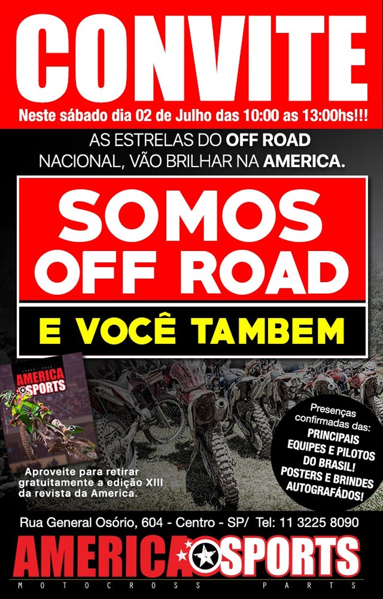 Como já está virando tradição, a America Sports promove neste sábado, 2 de julho, das 10h às 13h a confraternização Somos Off Road, com a presença confirmada de várias estrelas do cenário de competição nacional.