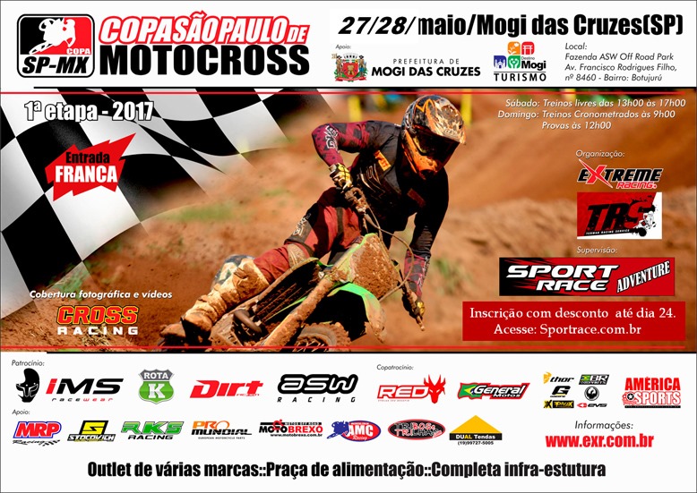 A primeira etapa da Copa São Paulo de Motocross está confirmada para os dias 27 e 28 de maio, na Fazenda ASW Off Road Park, em Mogi das Cruzes. O evento estava agendado para o início do mês, mas foi adiado devido a mudança na direção da Extreme Racing. O fundador Domingos Ramos de Oliveira Júnior vendeu a empresa, que passa a ser coordenada pelo experiente Amauri Corrêa a partir desta prova.