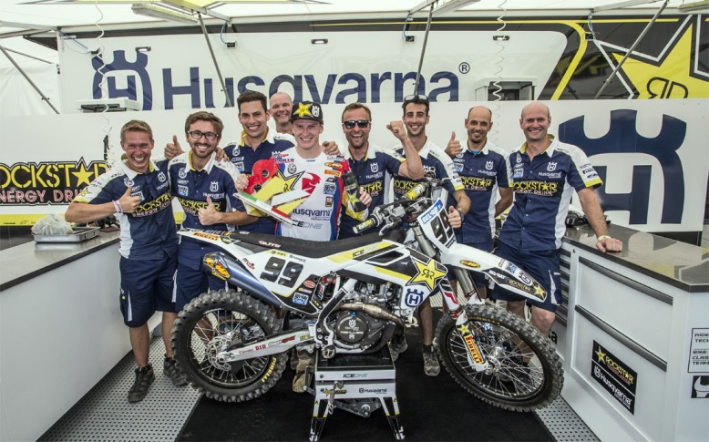 Antonio Cairoli e KTM De Carli celebram a vitória. Apesar de correr na MXGP, Herlings utiliza a estrutura da equipe MX2 chefiada por Dirk Gruebel