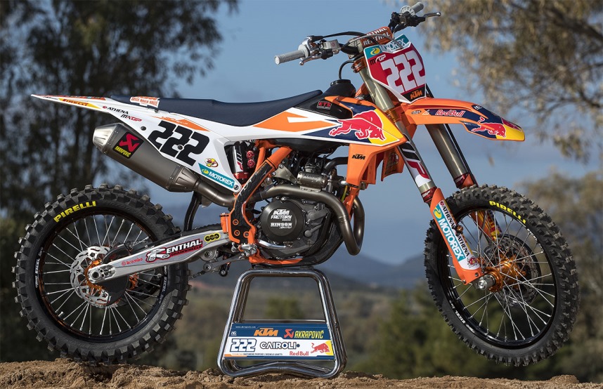 A KTM SX450F do atual campeão mundial Antônio Cairoli. O italiano usa o assento com um leve ressalto e tem as pedaleiras em posição ligeiramente mais alta que as motos de produção.