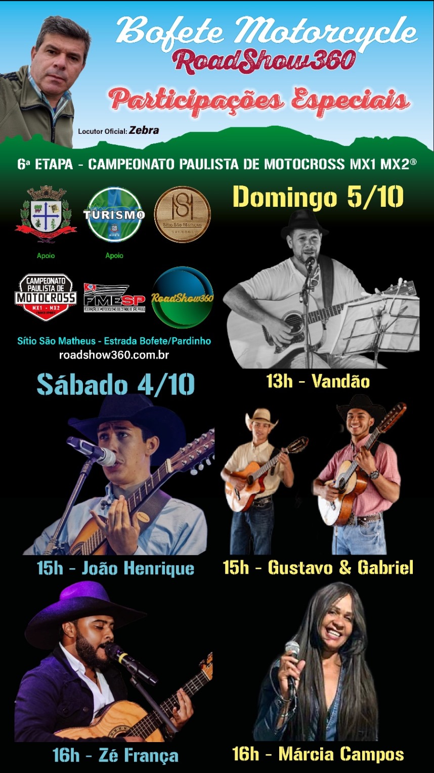 Com o lema "transformar adrenalina em desenvolvimento sustentável para municípios", o Road Show 360 acontece no próximo final de semana (4 e 5 de outubro), no Sítio São Matheus, em Bofete (Km 162 da Rodovia Castelo Branco), tendo como principal atração a sexta etapa do Campeonato Paulista de Motocross.