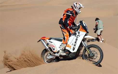 A liderança na maior parte do dia foi de Cyril Despres, mas um erro de navegação fez o francês perder posições no final, concluindo o trecho na sexta colocação. O mesmo ocorreu com Marc Coma, que seguia o adversário, mas ainda assim pode-se dizer que a sorte continua ao lado do espanhol, sexto colocado na etapa, que contou com um resultado ruim de David Fretigne. Pela primeira vez Fretigne terminou fora dos 10 primeiros colocados, com o 15ª tempo, ajudando Coma a manter a folgada margem que possui na soma total dos tempos. O piloto da Yamaha (WRF 450) perdeu mais vinte minutos em relação ao adversário que segue líder absoluto do rali com sua KTM (690 Rallye).