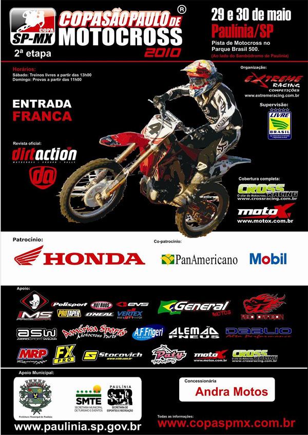 A Copa São Paulo de Motocross terá sua 2ª etapa neste final de semana, dias 29 e 30 de maio, em Paulínia. A Pista do Parque Brasil 500 já esta recebendo os ajustes finais para a competição que terá uma grande estrutura oferecida pela Prefeitura Municipal. A entrada é franca ao público que terá uma excelente infra-estrutura com arquibancadas, praça de alimentação e uma visão privilegiada de todo o circuito.