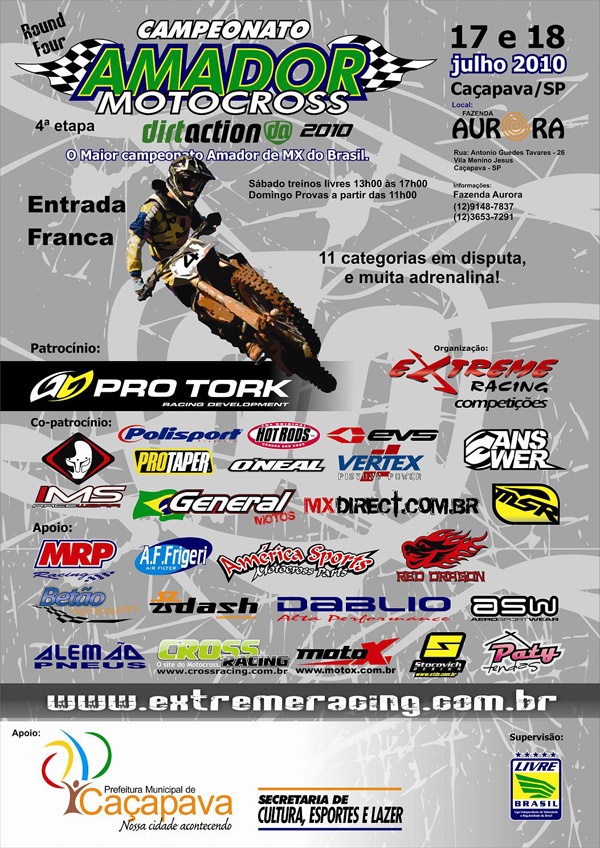 A Pista da Fazenda Aurora, em Caçapava (SP), recebe a quarta etapa do Campeonato Amador de Motocross Dirt Action, nos dias 17 e 18 de julho. Será a inauguração da pista de motocross em provas, o local já recebeu competições de Veloterra em outra pista, que continua em funcionamento e recebe toda semana diversos apaixonados por motociclismo off road. Na fazenda também há restaurante, pesqueiro e completa estrutura para os pilotos e seus familiares.