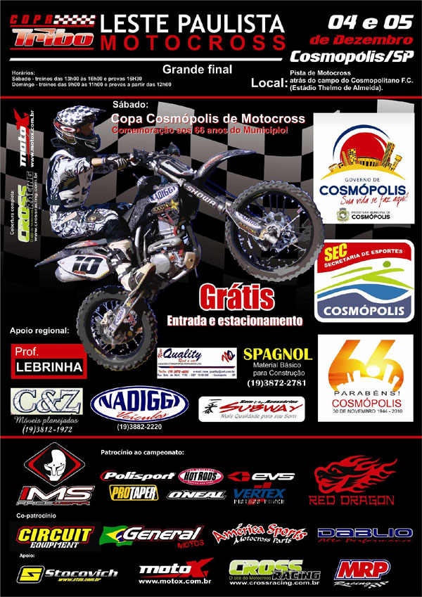 A cidade de Cosmópolis está comemorando 66 anos e motocross fará parte desta celebração O município recebe neste final de semana, dias 04 e 05 de novembro, a final da Copa Tribo Leste Paulista de Motocross, a cidade gosta do esporte e prepara uma grande festa com total apoio da Prefeitura Municipal.