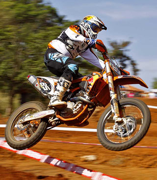 MX2 quanto na MX Open. Sem a participação de Thiago Piolli, segundo colocado na tabela, as coisas ficaram ainda mais fáceis. Deninho e Rodrigo Marty dividiram a primeira curva. Rodrigo tinha a preferência e acelerou. Houve o toque entre os dois e Deninho acabou ficando no chão. As emoções não acabaram por aí. Rodrigo vinha forte na ponta, mas Daniel Caputo insistia em se aproximar cada vez mais. Os dois se alternaram algumas vezes na dianteira, mas Rodrigo se firmou na ponta vencendo a difícil prova. Depois de reiniciar na última colocação, Deninho conseguiu um bom terceiro lugar, Felipe Zambrini e Claudiney Roma Júnior fizeram um duelo particular e Felipe levou a melhor ficando com a quarta colocação.