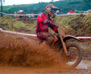 230cc, o sol voltou a brilhar forte e ajudou na melhoria da pista, mas ainda havia algumas poças de água. A categoria