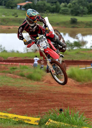 Força Livre Pró. Todos sabemos que uma bateria de motocross tem duas partes, uma que acaba no final da reta de largada, e outra que inicia depois da primeira curva. Fabinho fez a lição de casa com uma largada perfeita, e mais uma vez assumiu a liderança. Diego Henning, aquele a quem todos apontavam como o único em condições de superar Fabinho, ficou espremido no pelotão intermediário, tornando a vida de Fabinho muito mais fácil naquela prova. Como sempre sua tocada foi rápida, sem erros, e a cada volta ele consolidou a primeira posição até receber a bandeirada. Com a vitória estava configurado o empate.