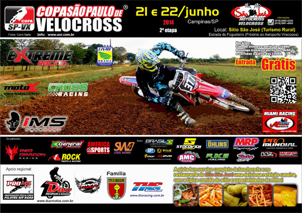 primeira etapa, em Santo Antônio do Pinhal. "Nós da Extreme Racing Competições, junto aos nossos patrocinadores e apoiadores, estamos nos dedicando para que a segunda etapa seja ainda melhor que a primeira. Acho que estamos no caminho certo para o desenvolvimento do Velocross no Estado de São Paulo", declarou Domingos Junior, proprietário da Extreme Racing Competições, organizadora do evento.